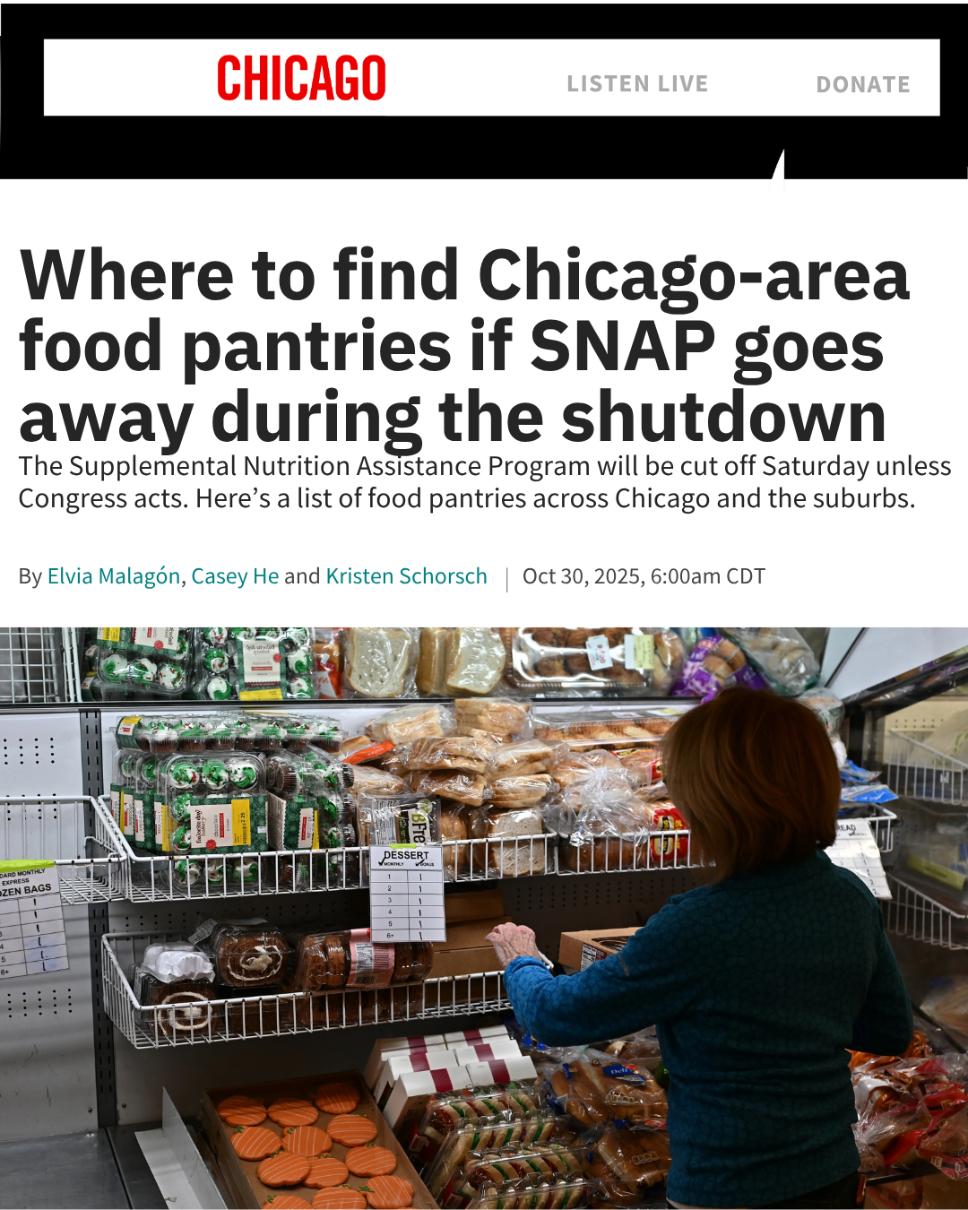 “As the government shutdown stretches into its fourth week, the nearly 2 million Illinoisans on the Supplemental Nutrition Assistance Program, or SNAP, are set to lose federal aid they rely on starting Nov. 1. . . Food pantries say they can’t fill in all the gaps, but they can help.”